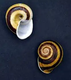 The shell's general color is a uniform light brown. The umbilicus is bordered by a cream-colored band, which is further bordered by two darker brown bands.[2]