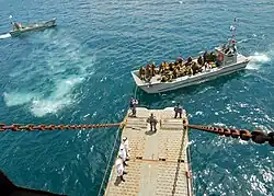 The LSMs were replaced by eight Balikpapan-class landing craft heavy which began to enter service in 1971. The first ship in the class, HMAS Balikpapan was briefly operated by the Army's Water Transport force but was later transferred to the Navy and all subsequent ships in the class were transferred to the Navy while they were under construction.[3] These ships proved to be very successful and supported Australian Army exercises and operations throughout South East Asia. Two ships, HMAS Buna and HMAS Salamaua, were transferred to the Papua New Guinea Defence Force in 1974. Three of the remaining craft were decommissioned in December 2012, with the remainder decommissioned in November 2014.[4][5]