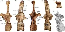 The third named Amphicoelias species, A. fragillimus, was known only from a single, incomplete 1.5 m (4.9 ft) tall neural arch, either last or second to last in the series of back vertebrae. Based only on an illustration published in 1878, this vertebra would have measured 2.7 meters (8.9 ft) tall in life.[8] However, it has been argued that the scale bar in the published description contained a typographical error, and the fossil vertebra was in fact only 1.38 meters (4.5 ft) tall.[9] In addition to this vertebra, Cope's field notes contain an entry for an "[i]mmense distal end of femur”, located only a few tens of meters away from the giant vertebra. It is likely that this undescribed leg bone belonged to the same individual animal as the neural spine, but it was never collected or described.[8] In 2018, A. fragillimus was given its own genus, Maraapunisaurus, and reclassified as a primitive rebbachisaurid.[10]