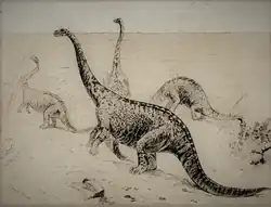 In 1877, a number of fossils were discovered by Oramel William Lucas in rock outcrops in Colorado close to Cañon City. These bones, including some named Laelaps trihedrodon, Camarasaurus supremus and Caulodon, were assumed to be from the Cretaceous Dakota Formation by paleontologist Edward Drinker Cope, from the same age as other Laelaps fossils.[1] Among the assortment of fossils discovered, a specimen including multiple dorsal vertebrae, a pubis, and a femur was found by Aaron Ripley, Lucas' brother-in-law, in Quarry XII. They were sent to Cope on October 21, 1877.[2] Cope concluded they belonged to a new taxon within Sauropoda, which Cope named Amphicoelias altus in December 1877.[3] Cope determined that the taxon would have been a sauropod related to Camarasaurus found nearby, both being large animals with lightly built vertebrae and solid limbs.[1] Cope sold his collection of fossils to the American Museum of Natural History (AMNH) in 1895. Shortly before his death in 1897, he worked with the museum's artist Charles R. Knight to produce illustrations and paintings depicting some of his species in life, including Amphicoelias. Based on notes accompanying his sketches provided to Knight as reference material, Cope evidently considered both Amphicoelias and Brontosaurus junior synonyms of Camarasaurus supremus at this time. The specimen was given the accession number AMNH 5764, then including two dorsals, a pubis, a femur, a tooth, a scapula, coracoid and an ulna. While the forelimb material was not originally assigned to Amphicoelias, paleontologists Henry Fairfield Osborn and Charles Mook in 1921 added them to the holotype specimen on the basis that they were found in the same strata not far away, and bore differences from the Camarasaurus they were found alongside.[4] Because of the uncertainty about the referral of these remains, in 2015 Emanuel Tschopp and colleagues hesitantly rejected the referral of the tooth, scapula and coracoid, but accepted the ulna referral.[5] Based on collection data, the specimen was determined to have come from the Late Jurassic Morrison Formation, in the youngest layers, separate from those that held the Camarasaurus fossils also described by Cope.[4]