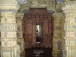 The shikhara over the shrine is intact and is very ornamental, while the roof of the mandapa has disappeared leaving the inner lintels of the ceiling. The ceiling at places where the original roof slabs are missing is filled in with Hero stones, undressed stones and other architectural members at a later period. The shikhara has four vertical spires with diminishing miniature shikharas capped with a flat amalaka. The walls are decorated with geometrical patterns but are devoid of images. The pillars are carved and consist of a square base over which an octagonal member is topped by a circle.
