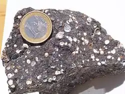 Amygdules or amygdales (/əˈmɪɡdjuːlz, -deɪlz/) form when the vesicles (pores from gas bubbles in lava) of a volcanic rock or other extrusive igneous rock are infilled with a secondary mineral, such as calcite, quartz, chlorite, or one of the zeolites.[1] Amygdules usually form after the rock has been emplaced, and are often associated with low-temperature alteration. Amygdules may often be concentrically zoned. Rocks containing amygdules can be described as amygdaloidal.