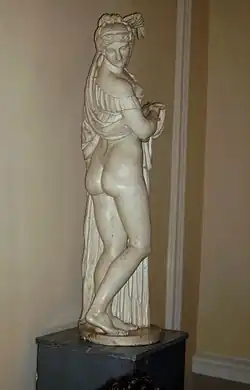 Terracotta hermaphrodite figurines in the so-called anasyromenos pose, with breasts and a long garment lifted to reveal a phallus, have been found from Sicily to Lesbos, dating back to the late Classical and early Hellenistic period. The anasyromenos pose, however, was not invented in the 4th century BCE; figures of this type drew on a much earlier eastern iconographic tradition employed for female divinities.[2] Ancient literature suggests that the figures represent the androgynous Cypriot deity Aphroditus (possibly a form of Astarte),[3] whose cult was introduced into mainland Greece between the 5th–4th century BCE. The revealed phallus was believed to have apotropaic magical powers, averting the evil eye or invidia and bestowing good luck.