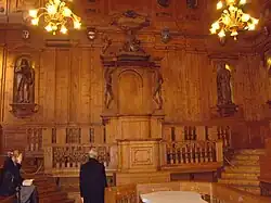 The Anatomical Theatre of the Archiginnasio is a hall once used for anatomy lectures and displays held at the medical school in Bologna, Italy that used to be located in the Palace of the Archiginnasio, the first unified seat of the University of Bologna. A first anatomical theatre was constructed in 1595, in a different location, but it was replaced by a bigger one built in 1637 in the current location, following the design of the architect Antonio Levanti.[1][2] The ceiling and the wall decoration were completed from 1647 to 1649 but only the lacunar ceiling dates from this period, with the figure of Apollo, the god of Medicine, in the middle, surrounded by symbolic images of constellations carved in wood.[2]