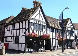 Crawley's oldest buildings surrounded the High Street, a north–south route which straddled the boundary of Crawley and Ifield parishes and formed part of the main road from London to Brighton and Shoreham on the English Channel coast.[12] Burgage plots—medieval land divisions with houses or other buildings which were rented from the Lord of the Manor—were particularly clearly defined on the east side of the High Street; the buildings within them usually faced the High Street, but plots were sometimes subdivided.[13] This is believed to have happened at the site of the Ancient Priors, where the main (15th-century) part of the building faces west on to the High Street, and the older section faces south and is hidden from view.[1][13] The latter is known to be the oldest structure remaining on Crawley High Street.[14]
