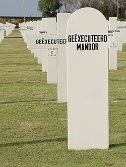 A grand and emotional tribute to the memory of those executed then took place. The Dutch flag was draped over the monument, the gravestones were decorated with palm branches, and rose petals were spread on all the graves. Many civilians from different countries, as well as soldiers, were lined up around the monument. A number of dignitaries attended the ceremony, including H.J. van Mook (the Lieutenant Governor-General of the Dutch East Indies), Lt. Gen. S. Spoor, V. Adm. A.S. Pinke, Gen. E.C. Mansergh (the British Commander-in-Chief of Allied Forces, Netherlands East Indies), and consular representatives of the United States, France and China.[3] The tribute was preceded by a prayer service by P.J. Willekens, the Apostolic Vicar of Batavia. After this ceremony, an honorary salute was given by units of the Royal Netherlands Navy, the Royal Netherlands Army, and the Royal Netherlands East Indies Army. During the oppressive moment when the Dutch flag was lowered to half-mast, the military band played Chopin's Marche funèbre. After this, Van Mook gave a short speech and said, among other things:
