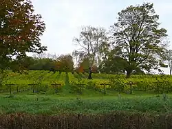 The vineyard is made up of two sites: Folly View site, of six and a half acres; and Town site, which is three and a half acres. Both are on the estate surrounding the house. The sites are south facing on limestone soils and have comparatively low rainfall. The initial planting of the vines was done in 2006, with a further plantations added in April 2007 and 2011. The estate adopted biodynamic agriculture practices in 2011 gaining organic certification in 2013 and Demeter certification in 2014[2]