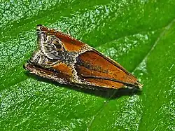 Ancylis obtusana has a wingspan of about 12 millimetres (0.47 in). The forewings are red brown, with a rounded reddish patch and the costa stringulated (finely streaked) with white and brown. The hind wings are brownish. Meyrick describes it - Forewings ferruginous, costa with dark fuscous and whitish strigidae; basal patch dark ferruginous-brown except towards costa, edge rounded, very oblique, reaching beyond middle of dorsum, followed by a grey-whitish stria broadly enlarged on costa; central fascia dark ferruginous-brown, with strong posterior median projection, not reaching dorsum; costal area beyond this dark ferruginous; ocellus small, broadly edged with leaden- metallic. Hind wings fuscous, darker terminally.[4] Julius von Kennel provides a full description.[5]