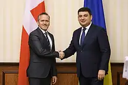 By late 2016, Samuelsen threatened to bring down the government of Prime Minister Lars Løkke Rasmussen because of disagreements over tax cuts, immigration and welfare policies. In September 2016, he announced that his party was ready to file a motion of no confidence if Rasmussen failed to cut the top rate of income tax by 5 percentage points in the 2017 budget.[3] In response, Rasmussen reshuffled his cabinet to have the Liberal Alliance join the government and take the leadership of six ministries.[4]