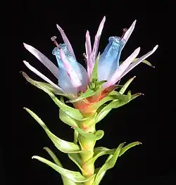 - Andersonia lehmanniana Sond. subsp. lehmanniana (the autonym)[7] is an erect, bushy, compact shrub 15–60 cm (5.9–23.6 in) high, with leaves mostly 3–7 mm (0.12–0.28 in) long and 2–3 mm (0.079–0.118 in) wide, flowers on the ends of branches, sepals usually about 7 mm (0.28 in) long, petals white, pink and blue and about 1 mm (0.039 in) shorter than the sepals, the lobes 3/4 as long as the petal tube[2][8]