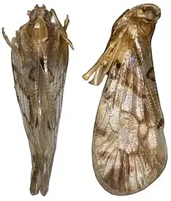 Body length of male is 6.2–6.5mm and female is 7.2 mm. Body and antennae yellowish brown. Eyes brown with faint yellow ocelli. Forewing semi-translucent. One long process arising from the base of the flagellum. A tan spot near claval fork found on the forewing.[1]
