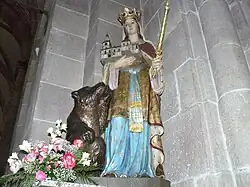 [32][33] Its Romanesque porch is a masterpiece of medieval Alsatian sculptural art. The crypt dates from the 11th century, the Virgin from the 15th and 16th centuries. The enormous 1715 pulpit. The tomb of Saint Richardis. Stalls from the 15th century. The present church was rebuilt in the 17th century. The massive sculpted frieze on the west wall is 30 m long and 0.60 m high and depicts animal motifs, characters (heroes of chivalry, history of Richardis, etc.). At the entrance are Christ and the Saints Peter and Paul with the first scenes of Genesis. The Abbey contains a very large number of items that are registered as historical objects.[32] - The Parish Church of Saint Fabien (14th century).