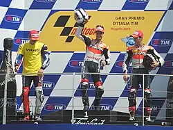 For the 2009 season, Dovizioso became an official Repsol Honda rider replacing Nicky Hayden and partnering Spain's Dani Pedrosa.[11] In July 2009, Dovizioso won his first race in MotoGP at the British Grand Prix in wet conditions at Donington Park.[12] Despite otherwise consistent points finishes, Dovizioso ended up with fewer points than in his début season in the class, finishing sixth in the final standings.