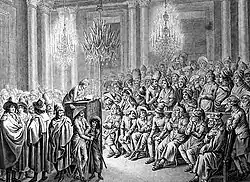Two days later, Hofmann helped found the Mainz Jacobin club and became one of its most active members. A popular and powerful orator, he criticised both the old regime of the Elector and the French military government in his speeches, which were especially supported by the more radical students[27] who idolised the incorruptible Hofmann.[28] In late 1792, he published the Aristokraten-Katechismus, a revolutionary pamphlet criticising the old regime and its instrumentalisation of religion to protect the absolutist order.[29] Hofmann and his supporters called for official posts to be reserved for native born citizens.[30] Hofmann lectured in the rural areas of the French occupied territory,[31] calling for support of the general elections in February and March 1793 which he helped organize.[32] He was elected into the Rhenish-German National Convention as a representative of Mainz[31] and became its president, beating Georg Forster in a contested election.[33] On 18 March 1793 Hofmann declared the Rhenish-German Free State from the balcony of the Deutschhaus.[1] Three days later, Hofmann signed the Convention's unanimously resolved decree asking for accession of the Free State to France. On 1 April 1793, Hofmann switched roles to become the president of the provisional administration.[16]