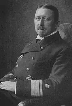 At the beginning of World War I, Michelsen was appointed commander of the armored cruiser SMS Prinz Adalbert. In addition to that command, from 20 April to 3 July 1915 he also held the position of Chief of Staff of the Scout Forces in the Eastern Baltic. In July 1915, the SMS Prinz Adalbert was severely damaged thanks to a torpedo attack, and Michelsen managed to tow it back to Kiel, running 240 nautical miles backward.[4] In August 1915, he was appointed Chief of Staff of the Supreme Command in the Eastern Baltic, and on 14 April 1916 he became Commander-in-Chief of the Torpedo Boats (Erster Führer der Torpedobootsstreitkräfte). In this position, he also took part in the Battle of Jutland, where he commanded the SMS Rostock.[5] On 1 June 1917 he was appointed commander of the submarine forces (Befehlshaber der U-Boote), which he held until the end of the war.[6]