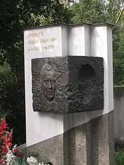 After retiring from active politics in 1989, Gromyko started working on his memoirs.[71] Gromyko died on 2 July 1989,[2] just 16 days before what would have been his 80th birthday, after being hospitalized for a vascular problem that was not further identified.[72] His death was followed by a minute of silence at the Congress of People's Deputies to commemorate him. The Telegraph Agency of the Soviet Union (TASS), the central news organ in the USSR, called him one of the country's most "prominent leaders". And the President of the United States, George H. W. Bush, sent his condolences to Gromyko's son, Anatoly.[73] Gromyko was offered a grave in the Kremlin Wall Necropolis, but at the request of his family he was not buried near the Moscow Kremlin Wall but instead at the Novodevichy Cemetery.[71][74][72]