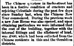 By 1886 Chinese migrants were nearly a third of the non-indigenous population of the rapidly-growing Cairns district, while in town one in five residents were Chinese.[29] Sachs Street near the town centre became the focus of Chinese commerce and community including shop keepers and merchant houses, two temples, and boarding and gaming houses.[7] Leon and James Ah Ching were among other Chinese investors who contributed to its development. Leon's early acquisitions provided the premises for Sam Sing and Co., Sun Wo Tiy, and Lee Yan Bros., the three largest and longest lasting Chinese merchant firms from the 1880s into the 1920s. His other properties included the Leon family home at 67 McLeod Street as well as a number of properties along the planned route of the Cairns-to-Herberton railway line. His holdings extended as far as Aramac. His last property acquisitions occurred during the 1893 depression.[30]