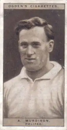 "A. Murdison. Halifax (Northern Rugby league.) "A. Murdison is one of the club's finest discoveries. Born in Lowden (sic), he became connected with the Galashiels Rugby Union club, and quickly won distinction as a centre three-quarter with wonderful anticipation, and before turning professional, represented his county, besides being captain of his side. He possesses great speed, and is a strong straight runner. He played in the trial games for the last Australian tour in 1924, and only just missed securing a place."[6]