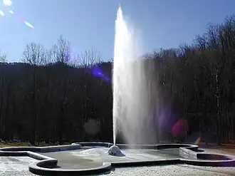 Andrews Geyser is a man-made fountain in Old Fort, North Carolina in McDowell County. The fountain is named for Colonel Alexander Boyd Andrews, a North Carolina native who was the Vice President of the Southern_Railway_(U.S.) Company and one of the people responsible for the construction of the railroad between Old Fort and Asheville, North Carolina, in the late 19th century. The fountain was constructed in 1885 with a dual purpose: it was a feature of the Round Knob Hotel, and a tribute to the approximately 120 individuals who died building the railroad through this particularly treacherous stretch of land, that culminates with the crossing of the Eastern Continental Divide through the Swannanoa Tunnel. The fountain was said to be eye-catching for railroad passengers ascending the 7.5 miles of track and six tunnels that peaks at the top of Swannanoa Gap because it could be seen several times along the route.
