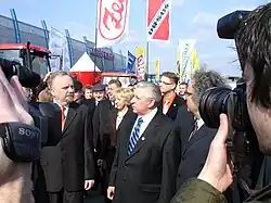 He was Deputy Prime Minister and Minister of Agriculture and Rural Development in the cabinet of Jarosław Kaczyński once from 5 May 2006 and 22 September 2006, and again from 16 October 2006 to 9 July 2007. Prior to entering politics, he was a professional farmer in the village of Zielnowo, Pomerania. Lepper entered Polish politics in 1991 as the leader of farmer protests, and founded Self-Defence as a political party and trade union in 1992.[9] His first political office was as councillor of the West Pomeranian Voivodeship Sejmik, which he was elected to in the 1998 Polish local elections as part of the Social Alliance coalition.[10] He was a candidate in the Polish presidential election in 1995, 2000, 2005 and 2010. He was also a candidate in the Polish parliamentary elections between 1991 Polish parliamentary election and 2007, becoming elected in 2001 and then in 2005.