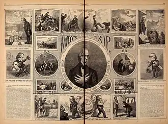 Andy's Trip is a multi-panel political cartoon by American artist Thomas Nast depicting the 1866 electioneering trip of U.S. president Andrew Johnson that came to be known as the Swing Around the Circle. Published as a double-page spread in the October 27, 1866 issue of Harper's Weekly, the image "delivered a blow"[1] and served as a "visual indictment of Johnson's behavior during his swing around the circle, divided by two dozen panels, with Johnson at the center wearing a halo and smiling beneath the words, a takeoff from his New York speech: 'Who has suffered more for you and for this Union than Andrew Johnson?'"[2] According to historian Fiona Halloran, "Hammering away, Nast insisted that it was Johnson who 'forgot' Union veterans and Union families."[1]