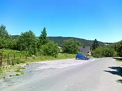 Approximately 50% of the slopes are forested, while the remaining areas are covered with meadows and arable fields.[2][4] All types of forestation can be found here: spruce forest, mixed forest,[a] and deciduous forest, with mixed forest predominating.[4][5] All slopes except the spruce forest display areas of mixed forest and patches of deciduous forest at lower elevations. Meadows and arable fields are found on the northeastern, eastern, southeastern, southern, and southwestern slopes.[4][5] From the open areas, there are views of the surrounding landscape and nearby peaks.[6] Nearly all slopes show significant variability in forest coverage, featuring large clearings and sparse areas. On the meadows and arable fields, almost linear tree zones separate different plots due to land and building registration.[4] There are no rock groups or large rock formations on the slopes, but the lower eastern slope and the base of the southern slope contain boulder fields. A 22 kV overhead power line runs at the foot of the northeastern, eastern, and southeastern slopes.[2]