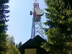 Anenský vrch has a main summit that is not accessible by any marked tourist trail. However, there is a main path leading to the summit from the yellow tourist trail. The summit is surrounded by dense spruce forest, which obstructs views, making it not a viewpoint. At the summit, there is a previously mentioned base transceiver station and a building housing the station's installations. The primary triangulation station is marked on maps with number 34, at an elevation of 860.69 m above sea level, and coordinates 50°04′25.70″N 17°22′41.17″E / 50.0738056°N 17.3781028°E, located about 5 m southeast of the summit. The State Administration of Land Surveying and Cadastre lists the highest point of the mountain at 860.7 m above sea level with coordinates 50°04′25.8″N 17°22′40.9″E / 50.073833°N 17.378028°E.[2][4][5]