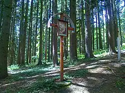 On the upper southeastern slope, along the nearly straight avenue named Alej k Anenskému vrchu,[10] along which there are many trees considered commemorative, the Stations of the Cross were marked in 2005.[11] The Stations are situated along the red tourist trail, between the Alej k Anenskému vrchu intersection (elevation of 775 m) and the Anenský vrch intersection near the St. Anne's Church. The route with 15 stations (13 on the left side and 2 on the right) is about 370 m long with a vertical rise of about 60 m, and an average distance between stations of around 30 m.[2] Each station has a wooden cross fixed with a concrete base, protected by a metal roof. Inside each cross is a framed passion painting by Czech sculptor František Nedomlel, depicting scenes from Jesus Christ's journey on the Via Dolorosa.[11]