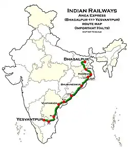 The 12253 / 12254 Anga Express is a train connecting Bhagalpur, the second largest city of Bihar, to Sir M. Visvesvaraya Terminal, Bengaluru (SMVB) in Bangalore, via Munger's Jamalpur Junction, Kolkata's Dankuni Junction, Bhubaneswar, Visakhapatnam and Vijayawada. In February 2017, the train was provided with the new LHB coach.[1]