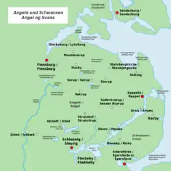 Angel Danish (German: Angeldänisch, Danish: Angeldansk or Angelbomål) was a variant of South Jutlandic spoken in the regions of Angeln and Schwansen in Southern Schleswig partly until the 20th century. Both landscapes belonged to the Danish Duchy of Schleswig until 1864, since then to Germany.