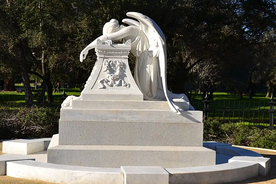 Prominent replicas of the Angel of Grief sculpture include the Henry Lathrop monument, located in the Stanford University Arboretum. Lathrop was the brother of Jane Stanford, the co-founder of the university. The original replica was built in 1901, but was severely damaged in the San Francisco earthquake of 1906, leading to its replacement in 1908. After years of neglect, the 1908 replacement was fully restored in 2001.[6][7][8] Another example is the Cassard angel, erected around 1908 in the Green-Wood Cemetery in Brooklyn, New York.[9]
