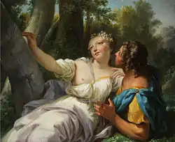 Angelica and Medoro was a popular subject for Romantic painters, composers and writers from the 16th until the 19th century.[1] Angelica and Medoro are two characters from the 16th-century Italian epic Orlando Furioso by Ludovico Ariosto. Angelica was an Asian princess at the court of Charlemagne who fell in love with the Saracen knight Medoro, and eloped with him to China. While in the original work Orlando was the main character, many adaptations focused purely or mainly on the love between Angelica and Medoro, with the favourite scenes in paintings being Angelica nursing Medoro, and Angelica carving their names into a tree, a scene which was the theme of at least 25 paintings between 1577 and 1825.[2]