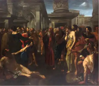 Despite the Caravaggist influences his work is characterised by its search for originality and a certain resistance to the triumphant absolutism of the Baroque style, which is expressed through some 'archaicizing' leanings in his work.[2][5] Caroselli was also active as an art restorer, copyist, and, possibly, forger.[6] In recent years a corpus of paintings has been attributed to a yet to be identified artist referred to with the notname of Pseudo-Caroselli. The style of the anonymous artist is so close to that of Caroselli that it is believed that this artist must have been in direct contact with Caroselli. The resulting similarity in styles has made it difficult to attribute certain works with certainty to either of the two artists.[1]