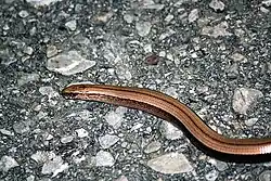 Slow worms[3] (also called blindworms and hazelworms) are a small genus (Anguis) of snake-like legless lizards in the family Anguidae. The genus contains five extant living species, including the common slow worm (A. fragilis), the eastern slow worm (A. colchica), the Greek slow worm (A. graeca), the Peloponnese slow worm (A. cephalonnica), and the Italian slow worm (A. veronensis). There are also known fossil species.