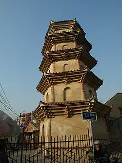 Surviving White Pagoda (center) of Shuixin Chan Temple (right), with the adjacent old residential neighborhood (left) demolished, to make way for new development (such as seen in the background) | |