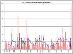 Kumble made his first-class debut for Karnataka against Hyderabad on 30 November 1989, taking 4 wickets and bagging a king pair. He was then selected for India Under-19s against Pakistan Under-19s, scoring 113 in the first test and 76 in the second. He made his ODI debut against Sri Lanka at Sharjah in the Austral-Asia Cup on 25 April 1990.[20] He played one more game in the series against Pakistan and ended up picking two wickets. His Test debut came in the same year when India toured England for a three-test series.[21] It was the second test of the series played at Manchester and he picked up 3 wickets conceding 105 runs in the first innings and went wicket-less in the second innings of the match which resulted in a draw.[22] He did not play any Tests until 1992. He picked up 13/138 in Irani Trophy against Delhi for Rest of India which ensured the latter's victory.[23][24] This performance helped him earn a place in the Indian side that toured South Africa and Zimbabwe. It was during the 1992 Indian tour of South Africa that he established himself as a quality spinner, taking eight wickets in the second Test. He took 18 wickets at an average of 25.94 and with an economy rate of 1.84 in the four-test series.[25] Later that year, when England toured India, Kumble took 21 wickets in three Tests at an average of 19.8.[26] He picked up seven wickets for 165 runs in the third Test of the series played at Bombay as India went on to win the match by an innings and 15 runs.[27] He was adjudged man of the match for his performance.[28]