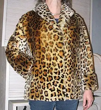 Animal print is a clothing and fashion style in which the garment is made to resemble the pattern of the skin and fur, feathers or scales of animals such as a jaguar, leopard, snow leopard, cheetah, zebra, giraffe, tiger or cow. Animal print is also used for room decoration, handbags and footwear and even some jewelry.[1] A major difference between animal prints and fur clothing is that animal prints today very often use fake fur instead of animal coat.