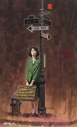 One of the letters was from Bannon, asking for professional assistance in getting published. On writing to Meaker, she said, "To this day I have no idea why she responded to me out of the thousands of letters she was getting at that time. Thank God she did. I was both thrilled and terrified."[16] Bannon visited Meaker and was introduced to Greenwich Village, which made a significant impression on Bannon: she called it "Emerald City, Wonderland, and Brigadoon combined—a place where gay people could walk the crooked streets hand in hand."[8] Meaker set up a meeting with Gold Medal Books editor Dick Carroll, who read Bannon's initial 600-page manuscript. It was a story about the women in her sorority whom she admired, with a subplot consisting of two sorority sisters who had fallen in love with each other. Carroll told her to take it back and focus on the two characters who had an affair. Bannon claims she went back and told their story, delivered the draft to Carroll and saw it published without a single word changed.[17] While raising two young children, Bannon lived in Philadelphia and took trips into New York City to visit Greenwich Village and stayed with friends. She said of the women she saw in Greenwich Village, "I wanted to be one of them, to speak to other women, if only in print. And so I made a beginning—and that beginning was the story that became Odd Girl Out."[18]