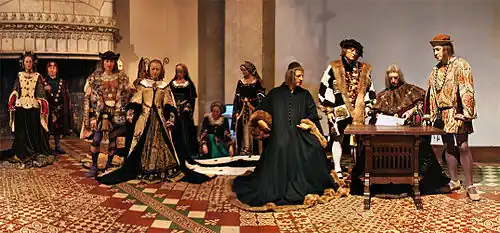 - ^ Those present and showed are from left to right: <according to Madame Amèlie Delaunay of the Chateau Staff>: Princess-Regent & Duchess Anne de Beaujeu [aged 31 at the time of the marriage and also referred-to as "Madame La Grande" by her contemporaries], and her husband and co-Regent, the Sire De Beaujeu – Pierre II, Duc de Bourbon; then King Charles VIII [aged 21] and Duchess Anne [aged 14]. Behind the Royal Couple, Bishop Louis D'Amboise [in the white Mitre] and Charles, Cardinal D'Amboise, the King's Minister of State [think "Prime Minister"], wearing the cloth-of-gold mitre. The lady kneeling to arrange Duchess Anne's train is a likeness of her Chaperone-Teacher-Companion, Madame Françoise de Dinan, the Lady of Chateaubriant and Laval. Two Breton ladies-in-waiting are mentioned as being present by Bishop D'Amboise in his report to the Pope, but were unnamed. Around the table, recreating the final reading of the Marriage Contract before Charles VIII and Anne sign it, are: the Notary-Public of Tours, seated; Duke Louis of Orléans (the future Louis XII), standing; Chancellor Guillaume of Rochefort, seated; and the Prince of Orange, standing. All the likenesses are the best that could be achieved by the Forensic Reconstruction Sculptors commissioned by the Institut de France for the 500th Anniversary of the marriage, in 1991.