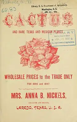 - ^ "Anna B. Nickels: Pioneer Texas Cactophile", Larry W. Mitich, Cactus & Succulent Journal, Vol. XLIII, p. 209-212, 227, 259-263