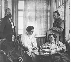 Anna Chertkova was seriously ill. Tolstoy admired her resilience and considered her one of those women for whom "the highest and living ideal is the coming of the Kingdom of God".[3] In the 1920s, she was engaged in sorting and describing the writer's manuscripts for the publication of his Complete Works. She also wrote a scholarly commentary on Leo Tolstoy's correspondence with her husband.[18] Anna Chertkova died in Moscow in 1927.[3] She was buried next to her husband in the Vvedenskoye cemetery (section 21).