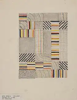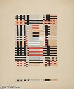 Albers was a designer who worked primarily in textiles and, late in life, with printmaking. She worked with multiple techniques, primarily lithography, embossing, silk-screening, and photo-offset.[33] She produced numerous designs in ink washes for her textiles, and occasionally experimented with jewellery design. Her woven works include many wall hangings, curtains and bedspreads, mounted "pictorial" images, and mass-produced yard material. Her weavings are often constructed of both traditional and industrial materials, not hesitating to combine jute, paper, horse hair, and cellophane.[34][35] Albers's early works, such as Drapery material (1923–26) and Design for Smyrna Rug (1925), display some of the characteristics that lasted throughout her career, notably her experimentation with colour, shape, scale and rhythm with abstract, crisscrossing geometric patterns.[36] Her work in printmaking was also experimental as she would "print lines multiple times, first positive then negative, [and print] off-register...She would explore the limits and possibilities of her tools."[33] To Albers, "there is no medium that cannot serve art."[33]