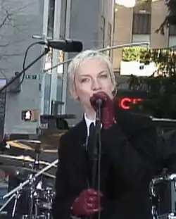 Ann Lennox OBE (born 25 December 1954) is a Scottish singer-songwriter, political activist and philanthropist. After achieving moderate success in the late 1970s as part of the new wave band the Tourists, she and fellow musician Dave Stewart went on to achieve international success in the 1980s as Eurythmics. When she appeared in the 1983 music video for "Sweet Dreams (Are Made of This)" with orange cropped hair and wearing a man's lounge suit, the BBC wrote, "all eyes were on Annie Lennox, the singer whose powerful androgynous look defied the male gaze". Subsequent hits with Eurythmics include "There Must Be an Angel (Playing with My Heart)", "Love Is a Stranger" and "Here Comes the Rain Again".
