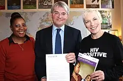 In November 2009, Lennox was awarded the Peace Summit Award 2009 by the World Summit of Nobel Peace Laureates for her engagement in the fight against the HIV pandemic in South Africa.[98] In June 2010, she was named as a UNESCO Goodwill Ambassador for AIDS,[99] a role that continues as of August 2013. Lennox also works with other organisations such as Oxfam, Amnesty International and the British Red Cross in regard to the issue.[100] Lennox also supports the Burma Campaign UK, a non-governmental organisation that addresses the suffering in Burma and promotes democratisation.[101]
