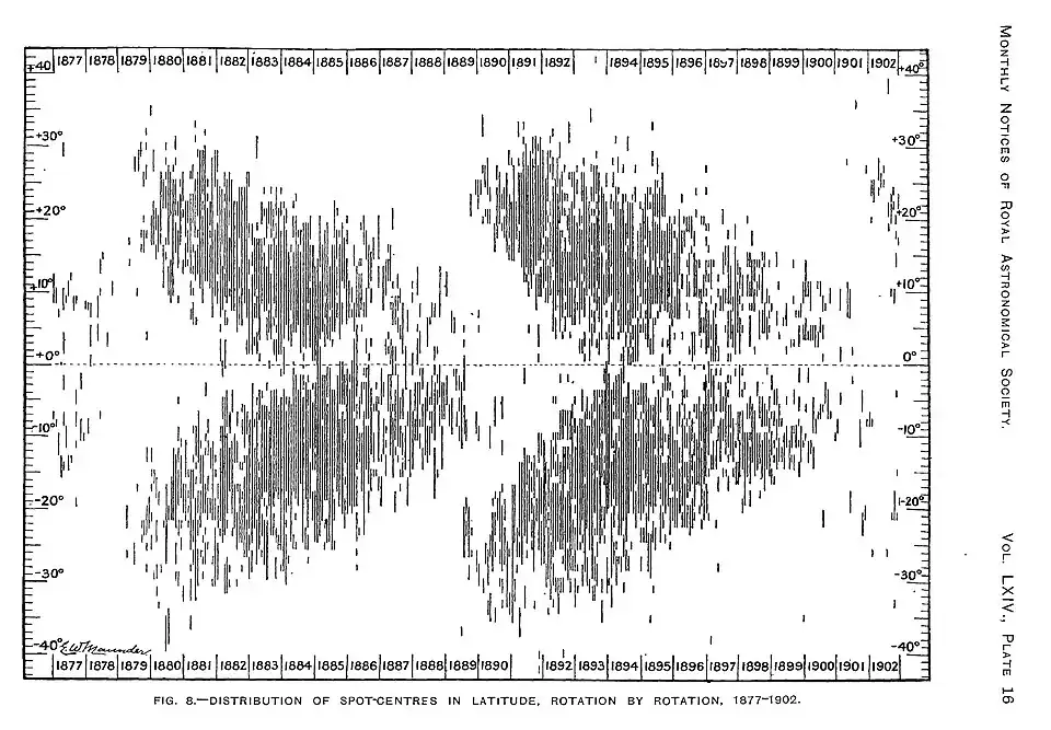 - Maunder, A S D; Maunder, E W (June 1905). "Rotation Period of the Sun from Greenwich Sun-spot Measures, 1879–1901". Monthly Notices of the Royal Astronomical Society. 65: 813–825. Bibcode:1905MNRAS..65..813M. doi:10.1093/mnras/65.8.813.