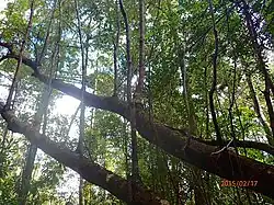 Anodopetalum biglandulosum is commonly known as horizontal scrub due to the habit of its slender trunk (primary shoot) bending down horizontally under its own weight. This fallen stem sends vertical branches up its length (secondary shoots), which in turn bend down and branches arise (tertiary shoots), forming an impenetrable horizontal scrub.[5] The creation of light gaps in the canopy changes light intensity, causing dormant buds at the branch nodes to overcome apical dominance and produce secondary and tertiary shoots.[6] Vegetative reproduction is the main mode of regeneration in A. biglandulosum. The species is commonly less than 8m in height but can grow up to 12m tall in deep soiled, sheltered gullies.[2]