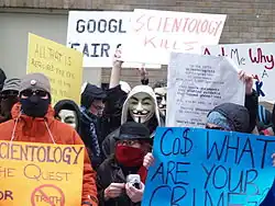 Anonymous (used as a mass noun) is a loosely associated international network of activist and hacktivist entities. A website nominally associated with the group describes it as "an internet gathering" with "a very loose and decentralized command structure that operates on ideas rather than directives".[33] The group became known for a series of well-publicized publicity stunts and distributed denial-of-service (DDoS) attacks on government, religious, and corporate websites. An image commonly associated with Anonymous is the "man without a head" represents leaderless organization and anonymity.[34]