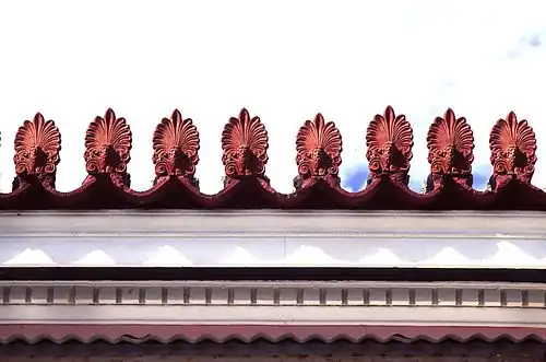 In architecture, an antefix (from Latin antefigere 'to fasten before') is a vertical block which terminates and conceals the covering tiles of a tiled roof (see imbrex and tegula, monk and nun). It also serves to protect the join from the elements. In grand buildings, the face of each stone antefix was richly carved, often with the anthemion ornament.[1] In less grand buildings moulded ceramic antefixes, usually terracotta, might be decorated with figures heads, either of humans, mythological creatures, or astrological iconography, especially in the Roman period. On temple roofs, maenads and satyrs were often alternated. The frightening features of the Gorgon, with its petrifying eyes and sharp teeth, was also a popular motif to ward off evil. A Roman example from the Augustan period features the butting heads of two billy goats. It may have had special significance in imperial Rome since the constellation Capricorn was adopted by the emperor Augustus as his own lucky star sign and appeared on coins and legionary standards.[2] By this time they were found on many large buildings, including private houses. The earliest examples in museum collections date back to the 7th century BCE in both Greece and Etruria.[2]