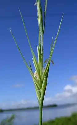 Members of Anthosachne are non-rhizomatous, perennial grasses with spikelike inflorescences having one spikelet per node.[1] They tend to differ from North American and Eurasian species of Elymus in having more slender stems, longer, usually curved awns, and glumes that are shorter in relation to the lemmas. They also differ in being hexaploids that combine the St, Y, and W genomes whereas Elymus consists of tetraploids and hexaploids that combine the St and H genomes. . The W genome is found only in Australasia, occurring also in the diploid genus Australopyrum.