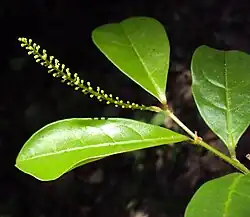 Distinguishing characteristics of this species are: the papery dull leaves and their size; domatia are present; the male flowers, at least, have a pubescent disc; usually 2 (rarely 1 or 3) stamens; an absent or small rudimentary ovary; size of the fruit; and female inflorescences and infructescences are usually 2–5 cm, rarely up to 9 cm.